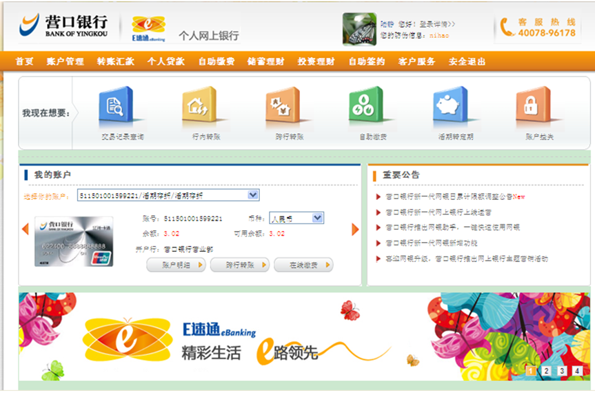 營口銀行個人網上銀行專業(yè)版提供賬戶管理、轉賬匯款、自助繳費、儲蓄理財、投資理財、自助簽約、客戶服務等功能。您可以選擇相應的菜單后點擊需要操作的子菜單進行操作。 |